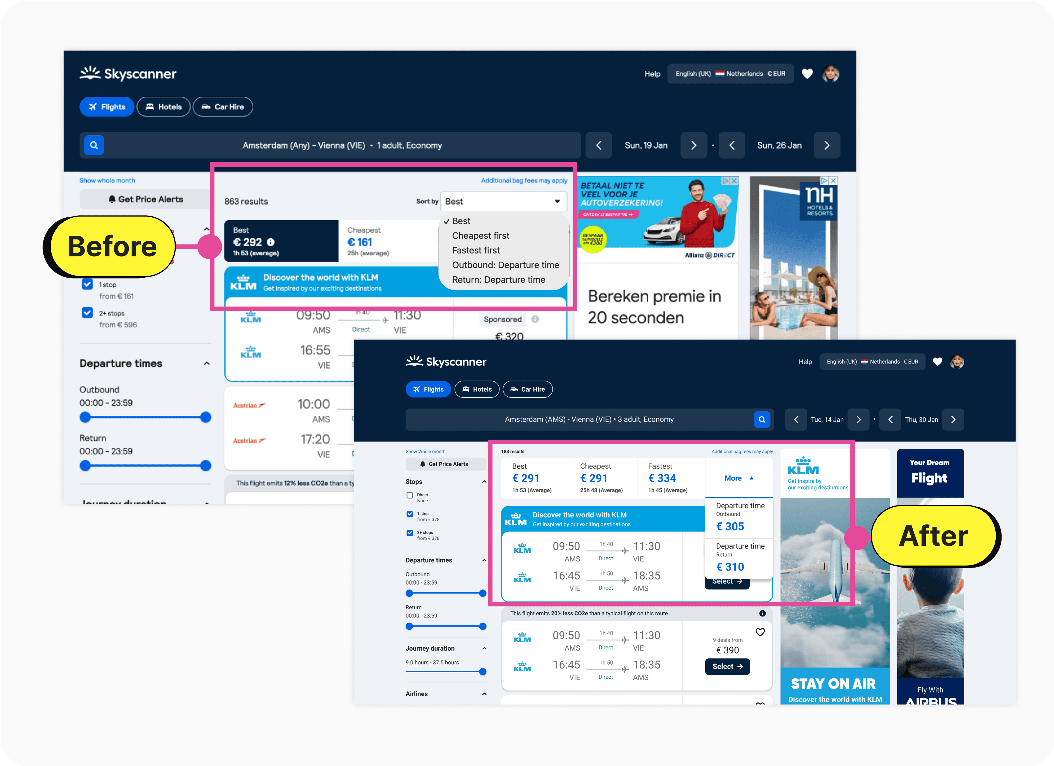 Enhanced Sorting and Filtering: Users can easily sort and filter flights based on return or departure criteria, aiding in quicker decision-making.