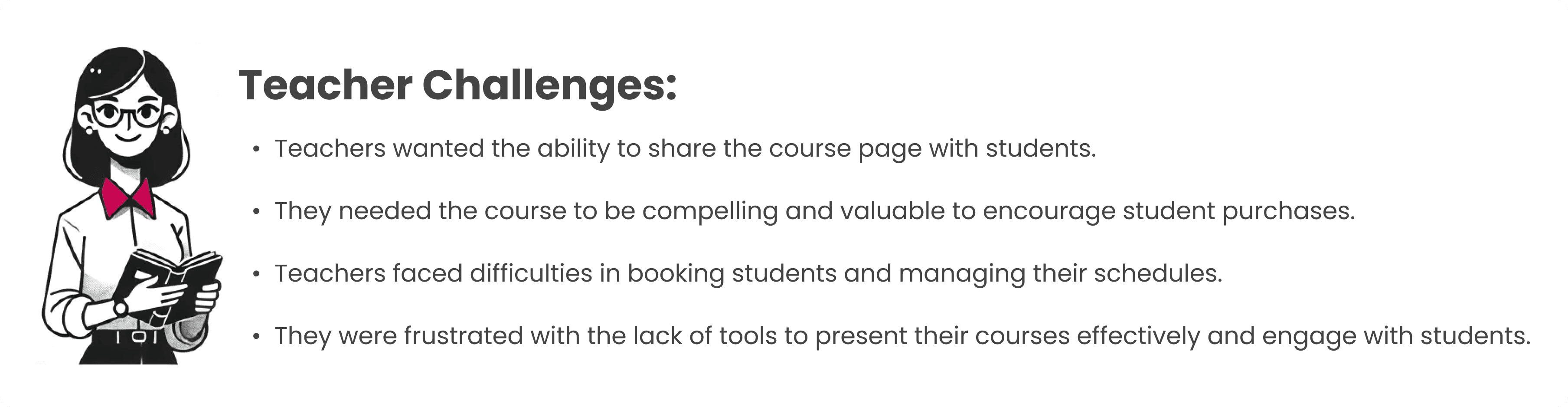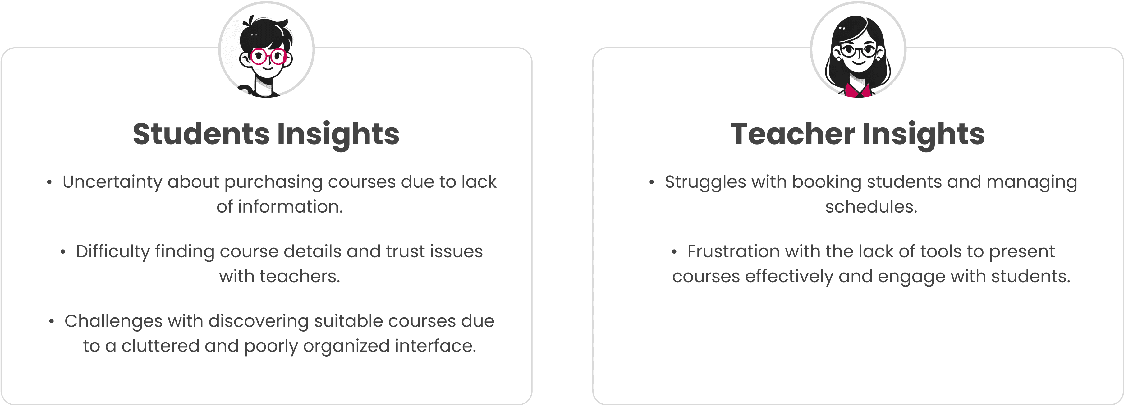 Through observation, interviews, surveys, and desk research, I identified several key pain points for both students and teachers: